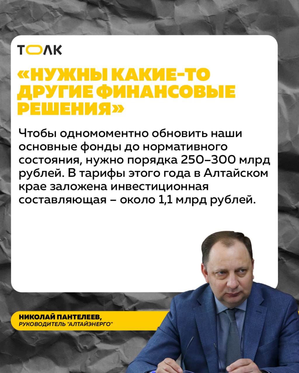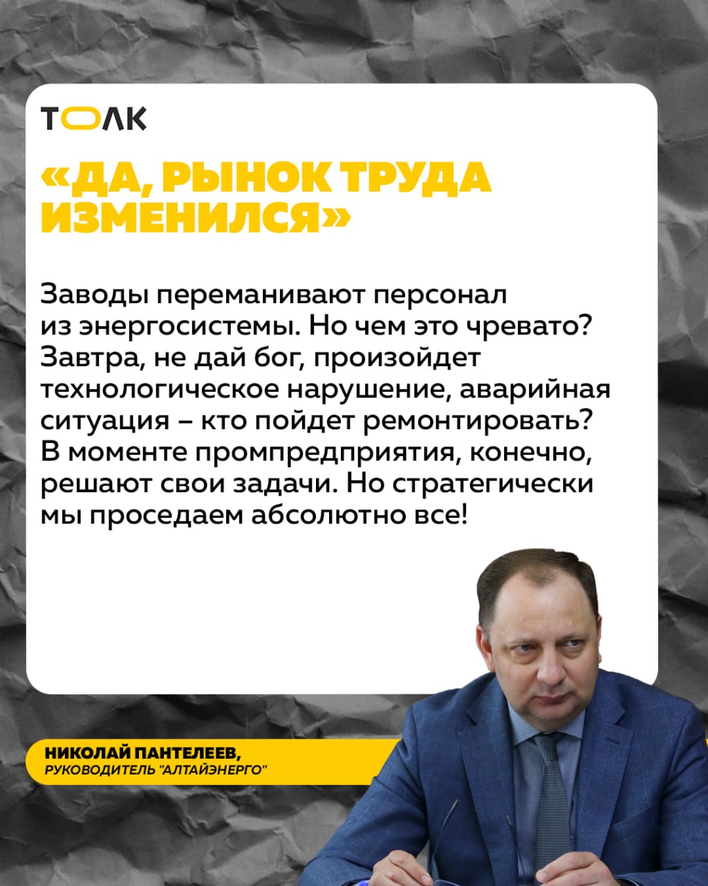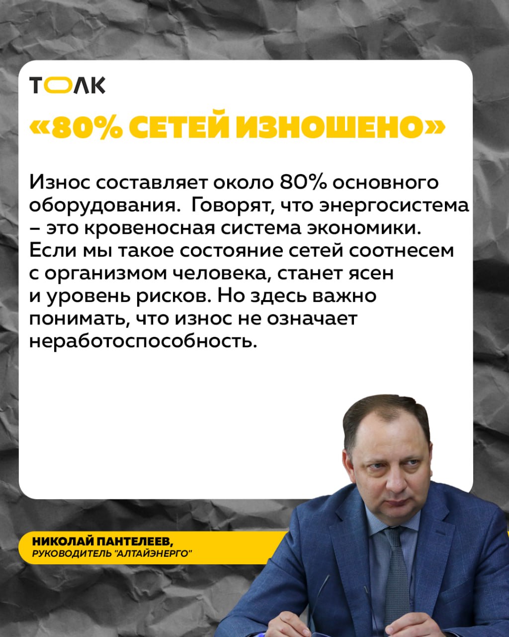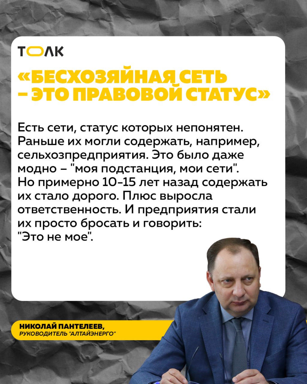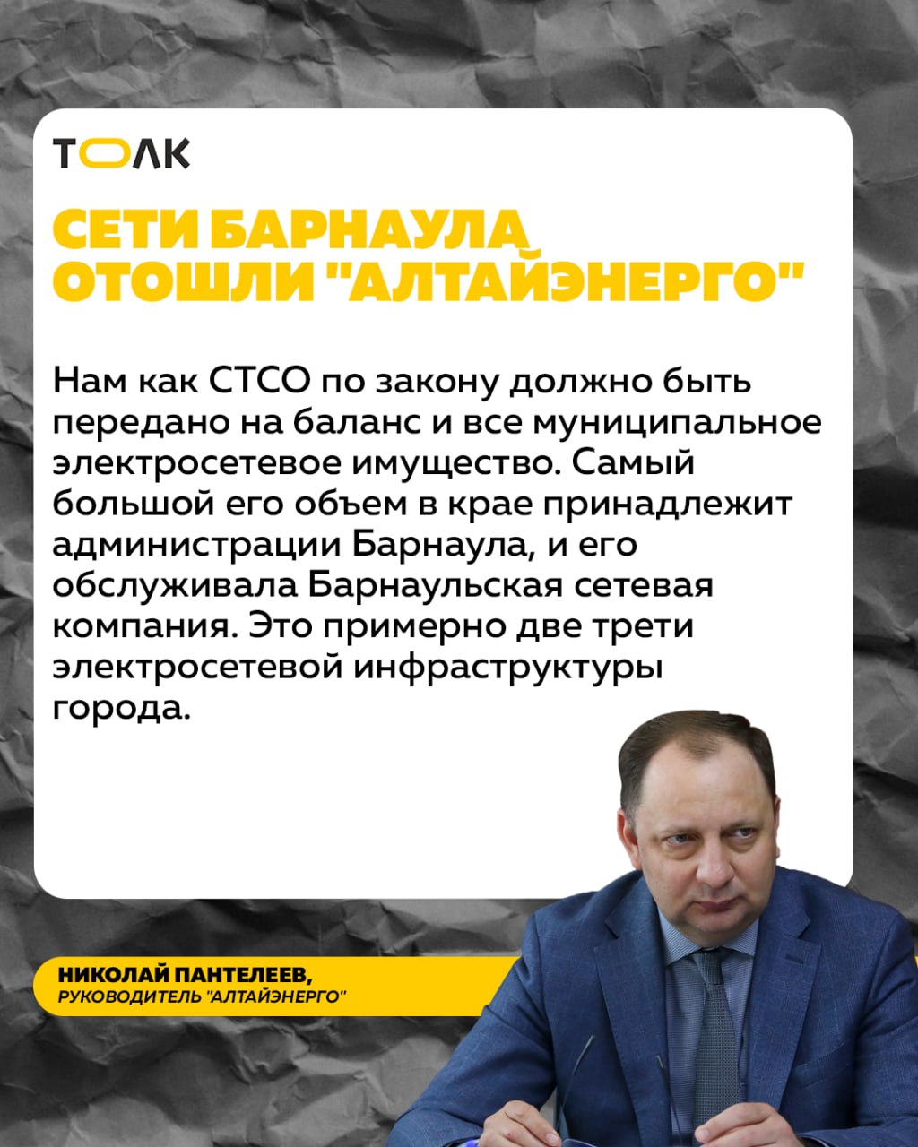 О том, как электроснабжение характеризует ситуацию в экономике, "наглеют" ли энергетики при повышении тарифов, почему долги за техприсоединение растут, как снежный ком, и зачем в регионе назначили главного по отрасли, "Толку" рассказал Николай Пантелеев, руководитель крупнейшего электроснабжающего предприятия Алтая – "Алтайэнерго" – филиала компании "Россети Сибирь".