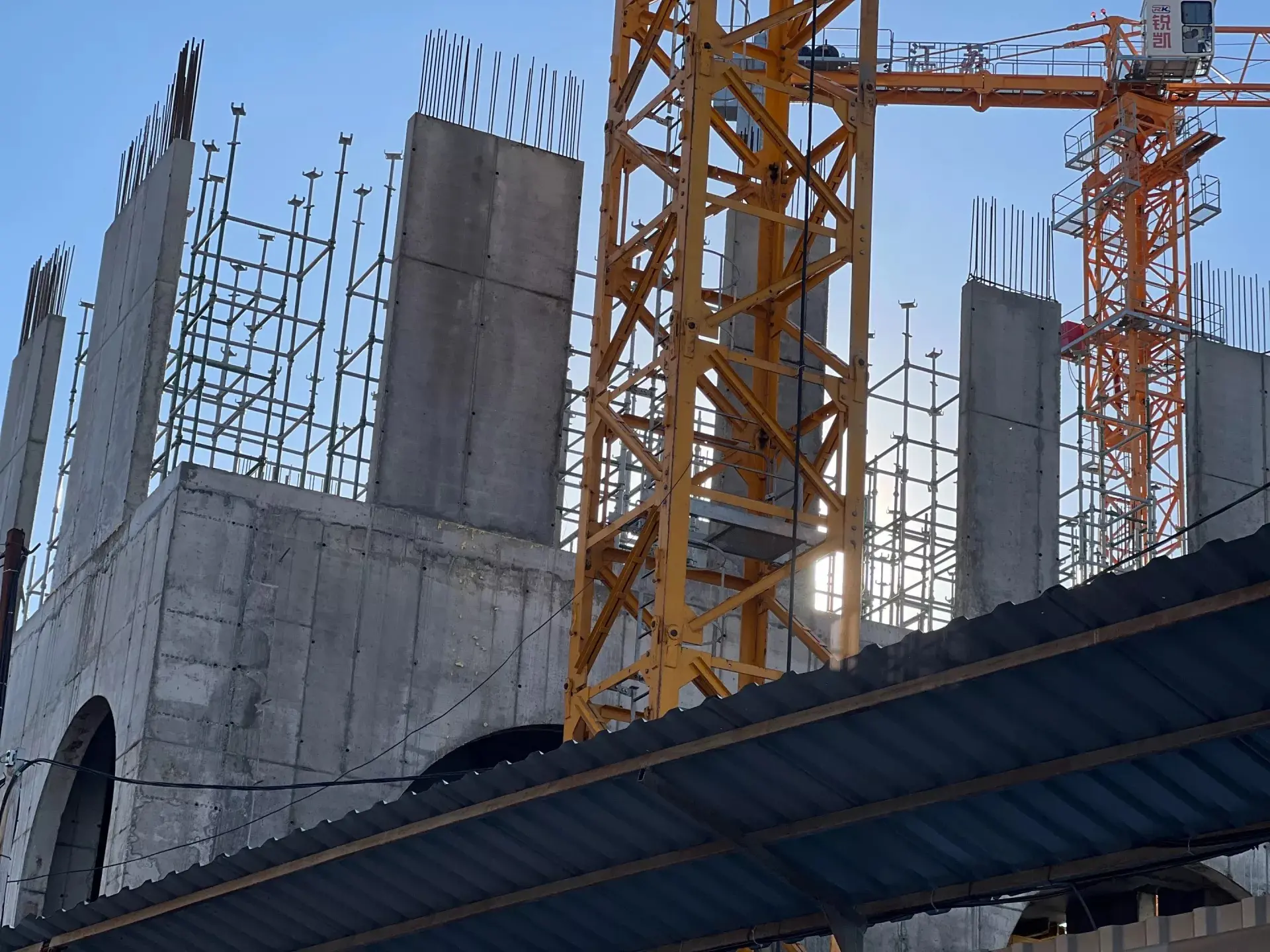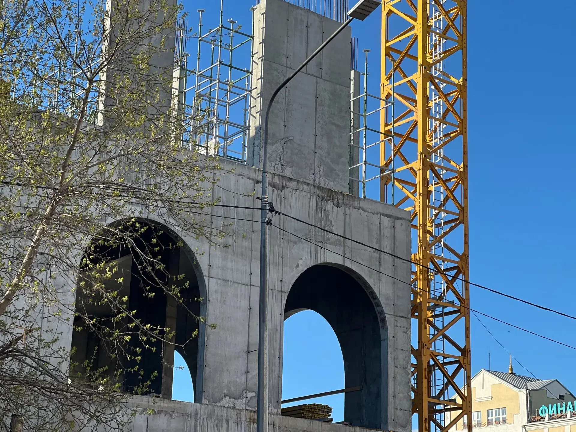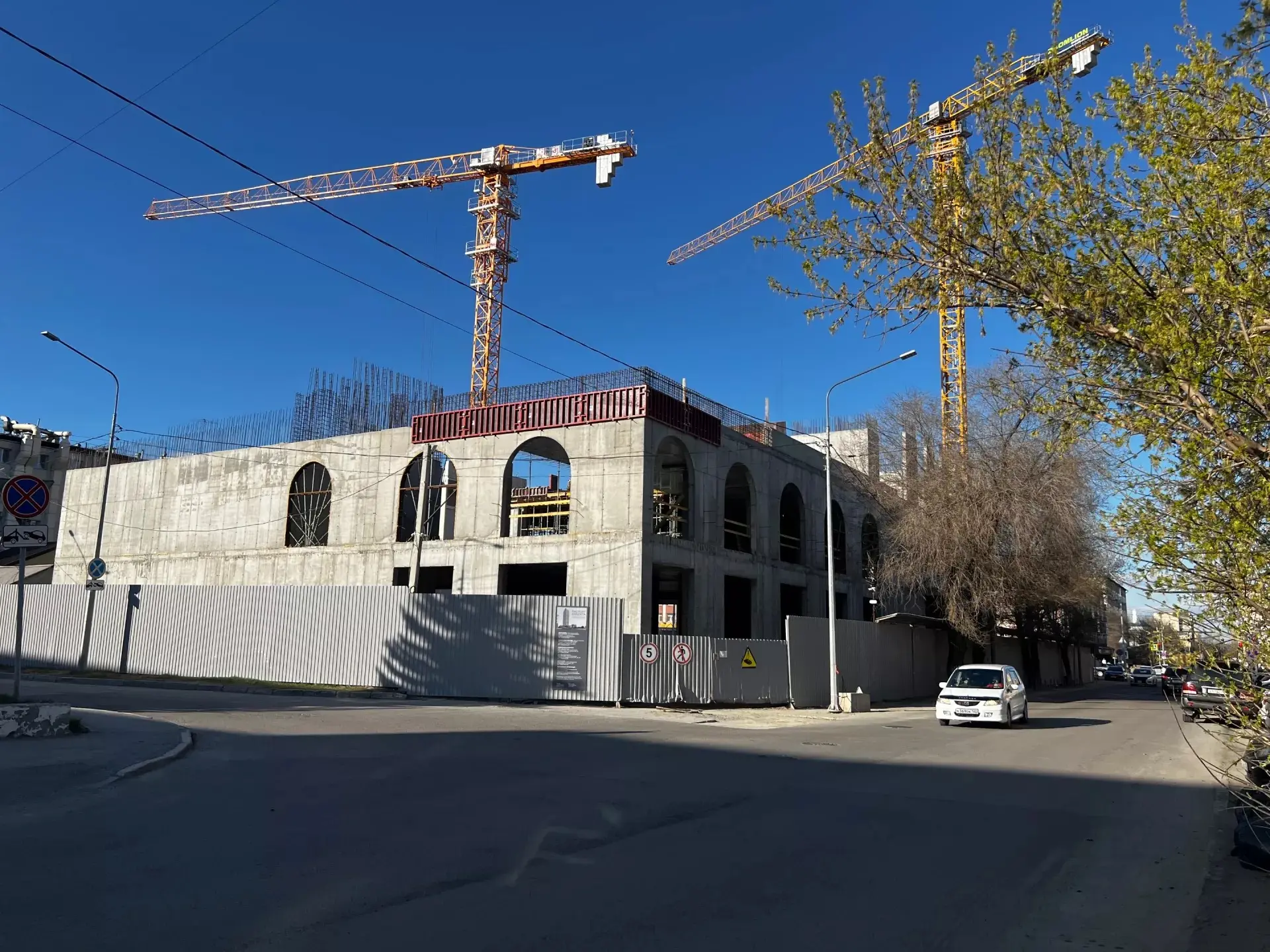 Строители уже создали три этажа – подземный и два наземных. Прохожие могут наблюдать арочные конструкции, возвышающиеся за забором. Также на стройплощадке началось возведение конструкций двух башен.