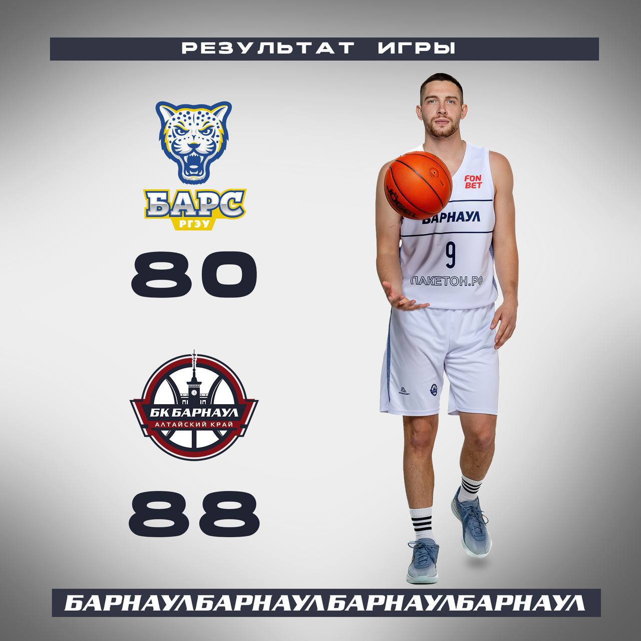 На выезде в Краснодаре нашу команду принимал ростовский «БАРС-РГЭУ». Три начальные четверти остались за «горожанами». Этого преимущества оказалось достаточно, чтобы удержать лидерство в заключительном отрезке. Итог матча — 80:88, победа алтайских спортсменов