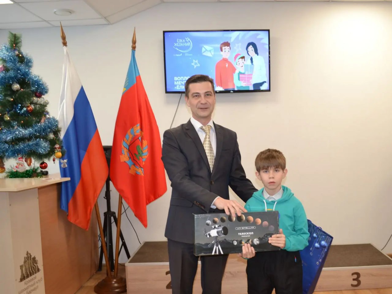 8-летний Миша Казанцев попал на финал краевого первенства по шахматам в Краевом шахматном клубе. Вместе со сверстниками он посетил шахматный музей, а во время церемонии награждения получил свой подарок — детский телескоп.