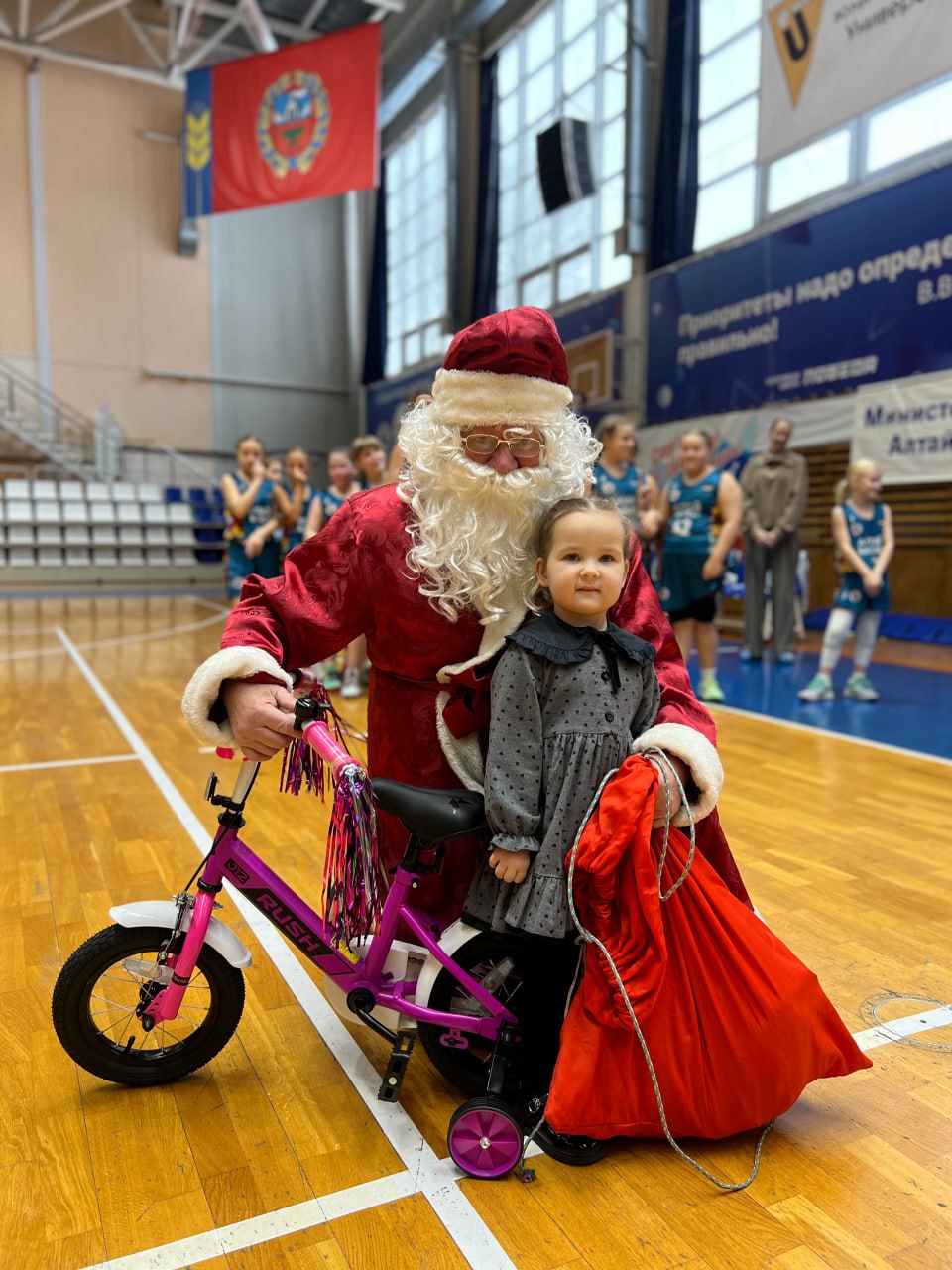 Директор СШ «АлтайБаскет» Владимир Самсонов во время ежегодной акции «Желания под ёлкой» и снял шар с желанием 3-летней Лии Плотниковой. Девочка загадала велосипед.